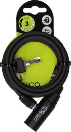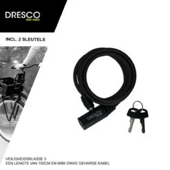 Het Dresco kabelslot 150/6 is een modern, compact en flexibel kabelslot voor dagelijks gebruik en uitermate geschikt om als tweede slot te gebruiken. Het slot heeft een lengte van 150 centimeter en heeft 6 millimeter dikke geharde kabel. Door zijn lengte zet je met dit spiraalslot de fiets makkelijk vast aan een vast object. De kabel heeft een coating die zorgt voor bescherming van de fiets tegen eventuele beschadigingen. Het slot is makkelijk in gebruik en zorgt dat u met de sleutels het slot snel en efficiënt uw fiets op slot kan zetten. Het spiraalslot neemt u makkelijk door hem bijvoorbeeld om de zadelpen te draaien.
