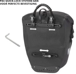 Bovenaan de tas vind je twee verende knijpklemmen, de Quick-Locks. Knijp deze in, hang de tas aan je bagagerek en laat los. De verende klemmen zitten nu vast om het ronde frame van je bagagedrager. Schuif nu de laatste vergrendelingklem onderop de tas achter het frame (wijst zichzelf) en klaar! Bekijk de foto’s om goed te zien hoe simpel het werkt. Je bent in 5 seconden klaar!