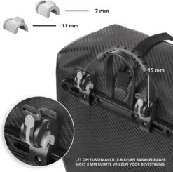Het maakt niet uit of je een reguliere fiets, elektrische fiets of sportfiets hebt. Zolang je fiets een bagagedrager heeft met een buisdiameter van 0.7 tot 1,5 cm kun je de tas bevestigen. Op 95% van alle fietsen met een bagagedrager met een buisdiameter van 0.7 tot 1.5 cm kun je de tas bevestigen. Bagagedragers worden door verschillende merken in verschillende buisdiktes geproduceerd en daarom leveren wij bij de tas 2 extra stelringen, zodat de tas passend gemaakt kan worden. Voor het monteren van de tas op een electrische fiets met accu is een minimale ruimte van 1.5 cm nodig. Alleen al in Nederland staan er 21 verschillende fietsmerken geregistreerd maar dit zijn er met de nog niet geregistreerde merken en buitenlandse merken nog veel meer. Vermenigvuldig dit met het aantal modellen en dan hebben we het over honderden fietsmodellen. Omdat ook fietsmodellen regelmatig wisselen is het voor ons onmogelijk om deze ontwikkelingen te volgen en U een garantie te geven dat de tas ook op uw fiets past maar uit onze ervaring weten we dat dit voor 95% van alle fietsen met bagagedrager gaat passen.
