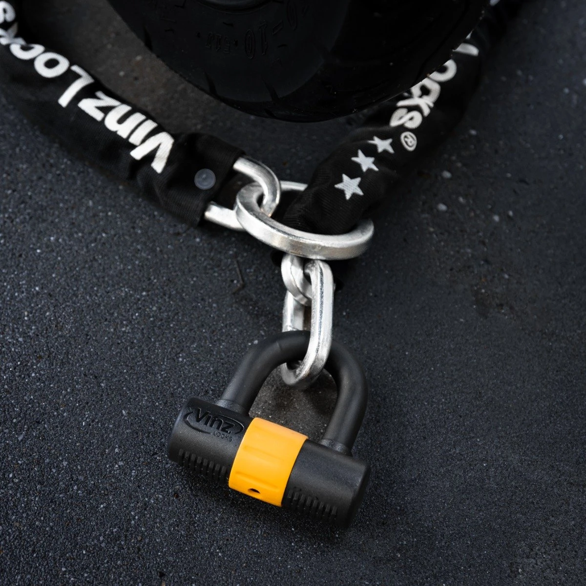 Het VINZ Kungur kettingslot leent zich uitstekend om je scooter of bromfiets te beveiligen tegen diefstal. De loop aan het uiteinde geeft de ketting meer reikwijdte. Dit is erg handig als het slot om een vast object wordt vastgemaakt zoals een lantaarnpaal of hek. Het slot van VINZ is ART 3 goedgekeurd en is gemaakt van gehard staal. Daarnaast is het slot ook te gebruiken als schijfremslot. Erg handig en functioneel! Het slot is naast scooterslot ook goedgekeurd als bootslot. Al met al kan worden gezegd dat dit een zeer multifunctioneel slot is.